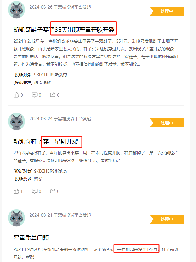 本月,有多名消费者在黑猫平台反馈,购买的斯凯奇鞋子出现开胶开裂的现象,还有一名消费者反馈在斯凯奇官方小程序购买鞋仅穿了一周的时间鞋子就出现明显的掉底开胶的情况。截止目前,斯凯奇近在平台投诉有1800余单,回复率仅63%。