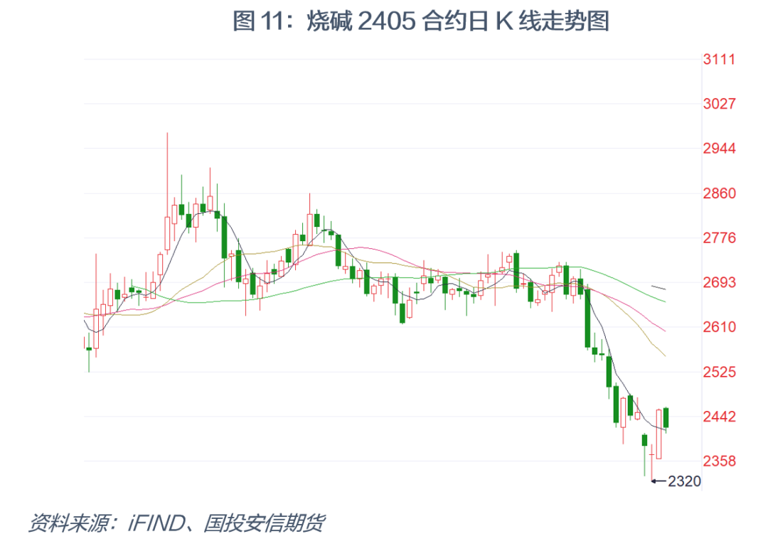 从技术上看,烧碱主力2405合约连续两日收带长下影线十字星,有技术上企稳的信号,之后收长阳线,回补清明节前后遗留的跳空缺口,并且收盘收在了缺口上方,盘面企稳反弹的技术势能较强。从基本面上来看,基本面利空阶段性在盘面有充分消化,但并不支撑价格反弹,一旦反弹拉开期现价差,则会引发套利盘介入。整体看,烧碱价格后期转入区间整理的可能性较高。