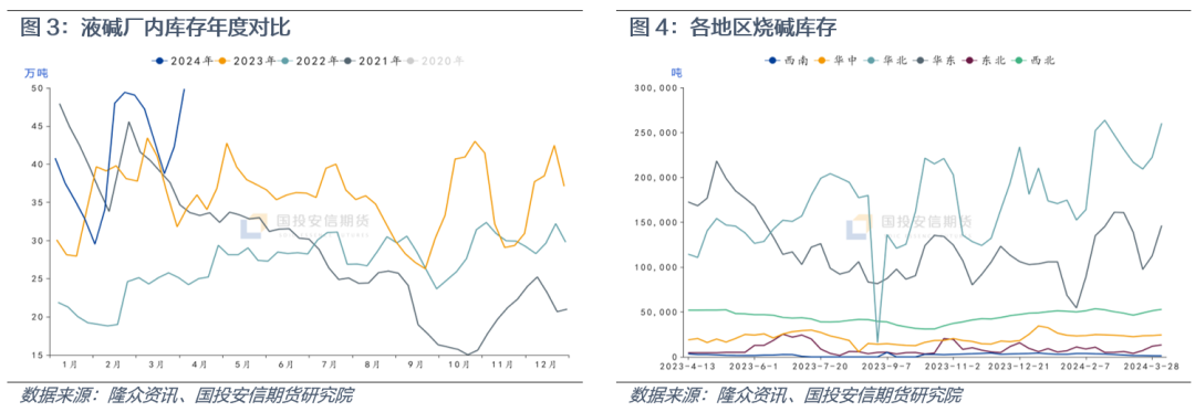 3月中旬以后烧碱库存出现明显累库趋势,截止到4月7日,全国20万吨及以上液碱样本企业厂库库存49.88万吨(湿吨),同比+45.48%。华北地区作为烧碱生产量最多的区域,3月中旬到4月初累库幅度达到20%,西北地区产量也较多,同期累库幅度14%。