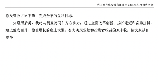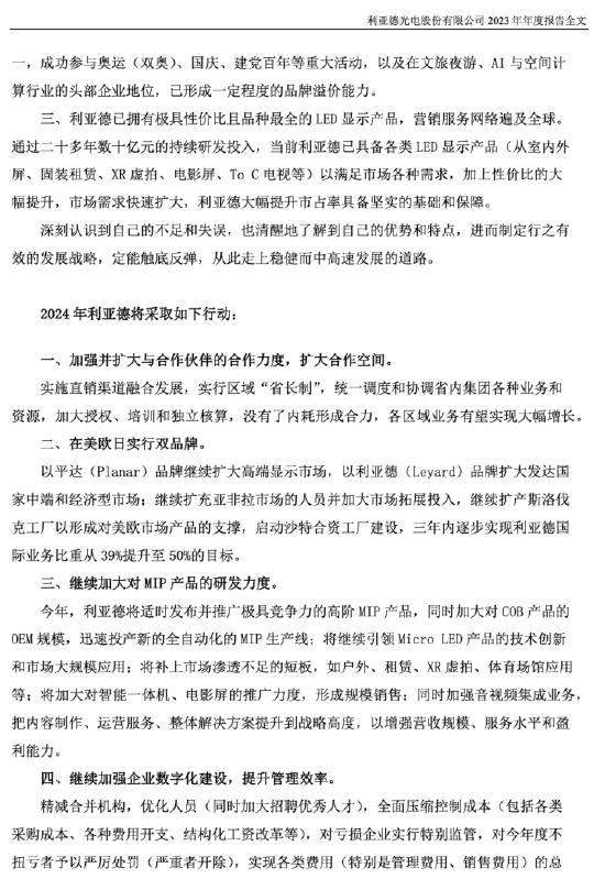 值得一提的是,在年报开篇,利亚德董事长李军发布致辞,并提及2023年导致公司股价大跌的五大失误,他用一首诗总结道:“羞愧难当发年报,业绩锥心责难逃;知耻后勇齐协力,发奋图强看今朝。”李军表示,2023年利亚德虽经营性现金流大幅增至近9亿,但同比净利仅是微增,营收还出现小幅下滑,严重低于投资者的预期,也导致股价大跌,给投资者造成了一定的损失。我作为公司的掌舵人,痛心疾首,羞愧难当,深感自责,经深刻反省,总结五大失误坦承。如下,供投资者批评指正: