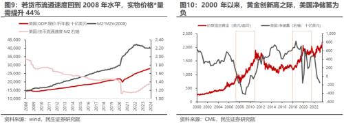 宽财政推动美元购买力走弱。次贷危机之后,美国MMT使得货币持续超发,然而货币流通速度的下行并未使得通胀大幅抬升,美元购买力下行有限,实际金价反而经历了回落。2021年之后,货币政策大幅宽松,叠加宽财政,美国M2和其流通速度均明显上升,通胀大幅抬升。若按照费雪方程式测算,当下实物价格和量的乘积需要提升44%,才能使得GDP与之相匹配。此外,财政的大量投入使得美国整体净储蓄转负,私人部门的投资无法支撑政府部门的开支。2000年至今,每一轮净储蓄转负都对应了金价的大幅抬升,或许这也暗示市场对于美元购买力下行的担忧,从持有货币转向持有实物。