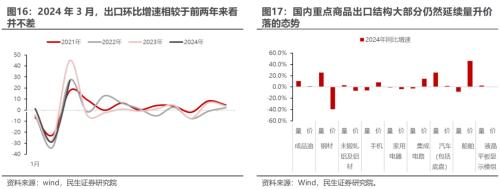 当下来看,当视野回归国内,地产开工面积的两个峰值是在2011年和2019年,增长15%,复合增速为1.5%。铜和螺纹消费复合增速分别为5.5%、5.8%,大幅低于了GDP的增长。相反,房价的涨幅和GDP相当,一定程度说明,地产过往对于GDP的拉动是通过房价实现的。房价通过金融化的方式,为高端消费和制造创造了利润空间,并形成了GDP。当下,房地产的下行从房价开始,而以螺纹钢为代表的实物消耗下滑远低于投资增速本身,也是因为如此。但是这种压力会更多传导到地产相关的消费领域。中国当下工业生产来看,生产活动持续与价格出现背离,出口同样如此,背景仍然是去金融化下利润空间被压缩,而实物消耗量持续上升。