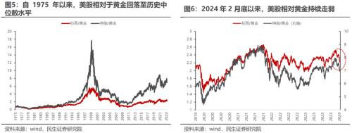 美国去金融化阶段,美股向实物资产回归。过去五十年,由于美国持续的放水、美股作为最具代表性的金融资产价格持续上涨,并于2000年的科网泡沫期间大幅领先黄金价格。互联网泡沫的破裂以及次贷危机使得实物资产价格崛起,然而这一趋势在2011年后被逆转,2020年的全球放水再次推升金融资产价格。回顾过去三年,2022年的加息使得金融资产显著走弱,然而2023年美国完美故事的演绎以及人工智能的兴起使得这一回归趋势被打破。2024年2月以来,金价的大幅上涨,叠加美股的停滞不前,使得实物资产的重要性再次抬升。从历史长河来看,当下美股/金价的价格仍然处于历史中位数偏上水平。实物价格的回归之路仍然有较大的空间。