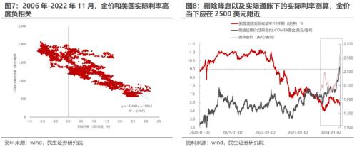 金价的上涨反映的是美元购买力的回落。剔除美国通胀来看,当下实际黄金价格已经突破历史新高,然而与之对应的是美国CPI的回落。往后看,通胀若维持当下的环比增速,同比的持续上行将是大概率事件,金价后续或仍有抬升空间。从实际利率来看,2003年至2023年上半年,美国实际利率与金价高度负相关,然而进入2023年9月,两者负相关性开始减弱,若按照当时的金价作为起点,以当下通胀和降息预期对应下的实际利率测算黄金价格,那么金价应该进一步上行。当下金价对应的通胀预期仍然被低估,对应金价在2500美元/盎司附近,仍有较大的涨幅空间。