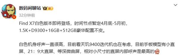 值得一提的是,爆料人士“数码闲聊站”还透露称,OPPO Find X7系列迭代机型有望推出相对小尺寸的直屏旗舰手机,目前内部呼声很高。