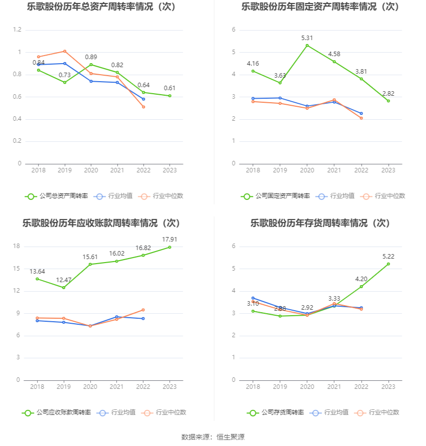 营运能力方面,2023年,公司公司总资产周转率为0.61次,上年同期为0.64次(2022年行业平均值为0.58次,公司位居同行业10/21);固定资产周转率为2.82次,上年同期为3.81次(2022年行业平均值为2.26次,公司位居同行业5/21);公司应收账款周转率、存货周转率分别为17.91次、5.22次。