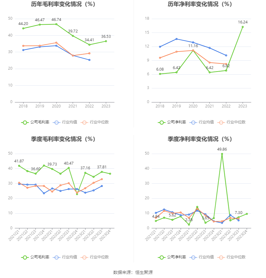 2023年,公司毛利率为36.53%,同比上升2.12个百分点;净利率为16.24%,较上年同期上升9.42个百分点。从单季度指标来看,2023年第四季度公司毛利率为36.55%,同比上升13.71个百分点,环比下降1.26个百分点;净利率为9.61%,较上年同期上升2.87个百分点,较上一季度上升2.31个百分点。