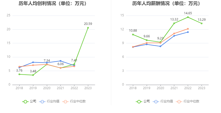 截至2023年末,公司员工总数为3078人,人均创收126.76万元,人均创利20.59万元,人均薪酬13.29万元,较上年同期分别变化16.63%、177.86%、-9.25%。