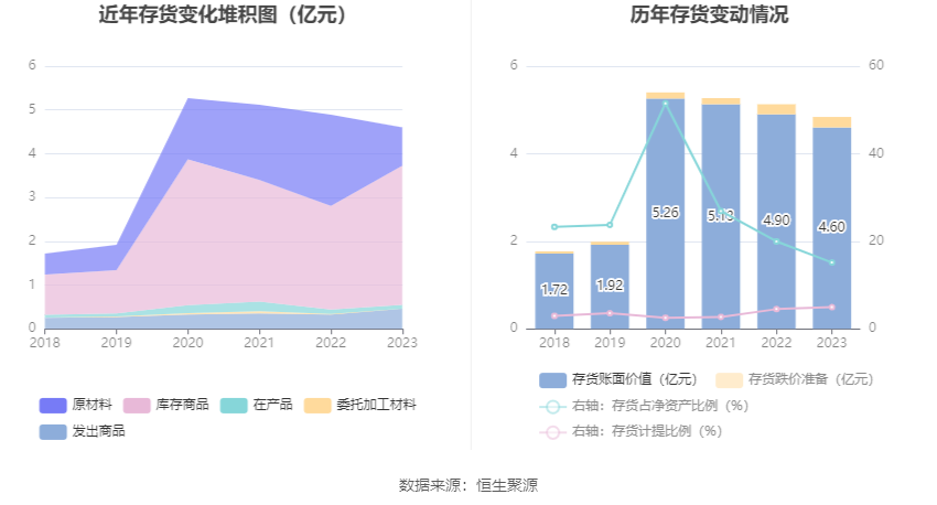 从存货变动来看,截至2023年年末,公司存货账面价值为4.6亿元,占净资产的15.14%,较上年末减少2985.39万元。其中,存货跌价准备为2396.09万元,计提比例为4.95%。