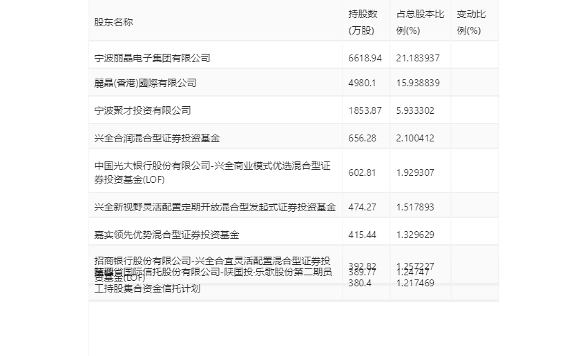 年报显示,2023年年末公司十大流通股东中,新进股东为兴全合润混合型证券投资基金、中国光大银行股份有限公司-兴全商业模式优选混合型证券投资基金(LOF)、兴全新视野灵活配置定期开放混合型发起式证券投资基金、招商银行股份有限公司-兴全合宜灵活配置混合型证券投资基金(LOF),取代了三季度末的宁聚量化优选证券投资基金、理想资本消费无限1号私募证券投资基金、项乐宏、姜艺。在具体持股比例上,宁波丽晶电子集团有限公司、麗晶(香港)國際有限公司、宁波聚才投资有限公司、嘉实领先优势混合型证券投资基金、董樑、陕西省国际信托股份有限公司-陕国投·乐歌股份第二期员工持股集合资金信托计划持股有所下降。