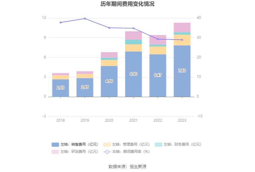 2023年,公司期间费用为11.28亿元,较上年同期增加1.90亿元;但期间费用率为28.92%,较上年同期下降0.34个百分点。其中,销售费用同比增长21.09%,管理费用同比增长36.95%,研发费用同比增长0.73%,财务费用同比增长28.48%。