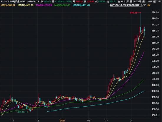 沪金2408合约今年以来的涨幅也达到17%左右,其曾经在4月15日一度涨至589.62元/克,然而这两天同样出现震荡。