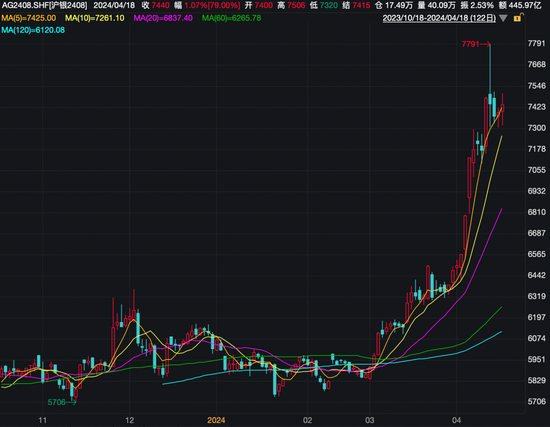 另外,沪银2408合约也是从今年3月以来开启一轮上涨行情,并且在4月涨势更加强劲,到4月15日一度涨至7791元/千克的位置,但本周价格波动也很明显;其今年以来涨幅达到23%左右。