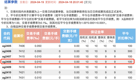 另外,当前,白银期货AG2408合约的平今折扣率为100%,交易手续费额为0,则其平今仓手续费额为0。