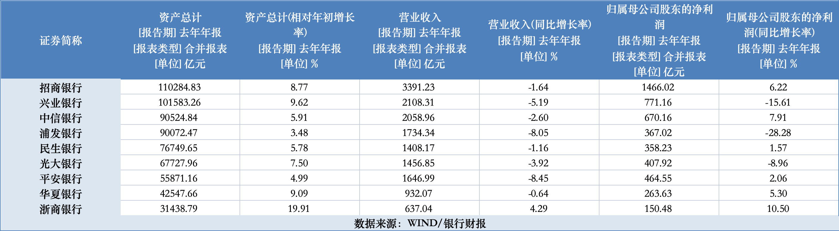 股价走势分化背后,复盘去年的基本面表现,分化迹象也已十分明显。从目前已经披露的年报数据来看,去年资产规模前三的银行座次发生变化,中信银行超过浦发银行进入前三;最赚钱的三大股份行仍是招商银行、兴业银行、中信银行,营收方面,除浙商银行外,8家股份行均呈负增长,3家归母净利润负增长,其中2家出现双位数降幅,浙商、中信、招行、华夏保持在5%以上增速。
