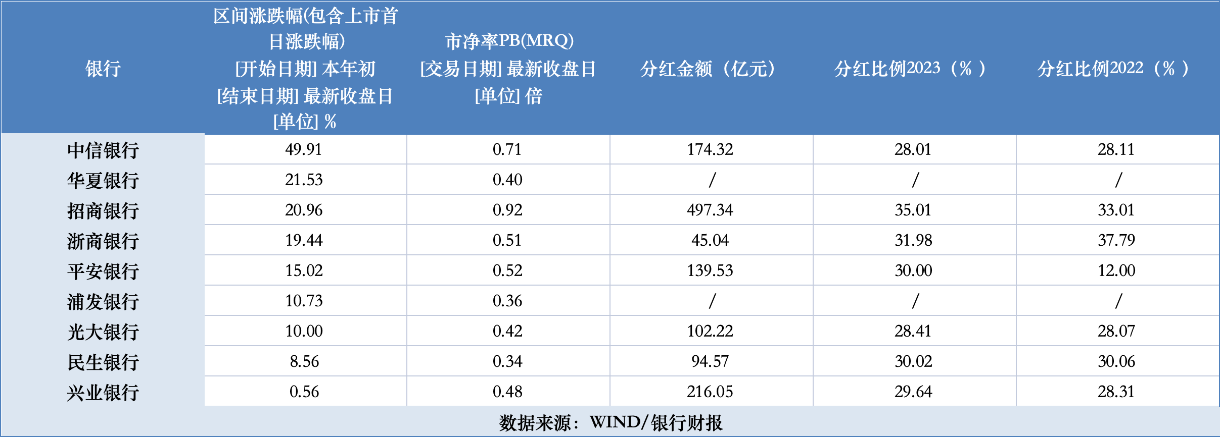 不少机构分析,当前市场对银行股的关注主线仍是防御特性与低估值、高股息,新“国九条”进一步带动情绪。去年以来,银行板块在国有大行带领下走出不错行情,今年中信银行则势头更猛,在股份行中,涨幅比过去资金最偏爱的招商银行(600036.SH,03968.HK)高出了约30个百分点,同期,民生银行(8.56%)、兴业银行(0.56%)涨幅则不足10%。