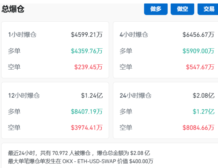 比特币上下大幅波动,CoinGlass数据显示,最近24个小时,虚拟货币市场共有7万余人爆仓,爆仓总金额为2.08亿美元(约合15.06亿元人民币)。