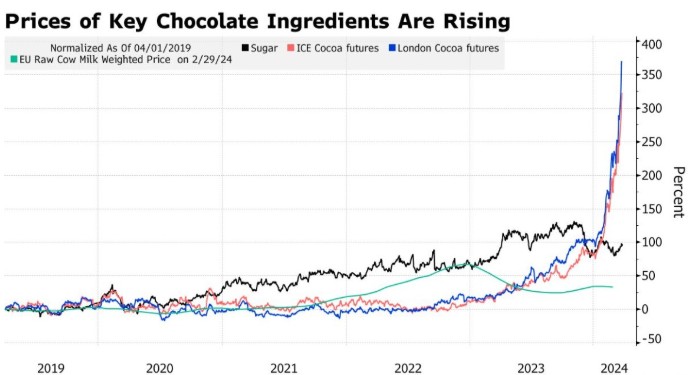 今年可可价格的突然大幅上涨,正对全球巧克力库存造成影响。投资者纷纷评估,如果这种关键原料的成本持续走高,糖果公司可能面临的影响。可可期货价格在2024年上涨了一倍多,本周飙升至每吨1万美元以上,这是前所未有的。这种大宗商品的表现甚至超过了人工智能宠儿英伟达(NVDA.US)的耀眼表现,甚至比铜还贵。