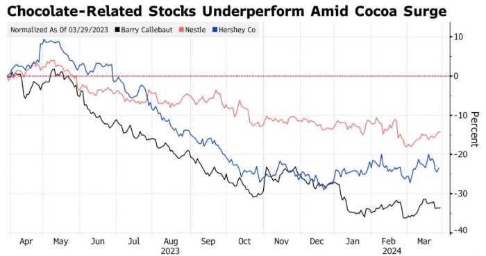 全球巧克力相关股票已经感受到了焦灼。瑞士的雀巢、吉百利和巧克力生产商亿滋以及全球最大的散装巧克力生产商百乐嘉利宝今年都出现了下滑。而且,除了可可之外,原糖价格近期也走高。周五,原糖纽约期货价格上涨0.6%