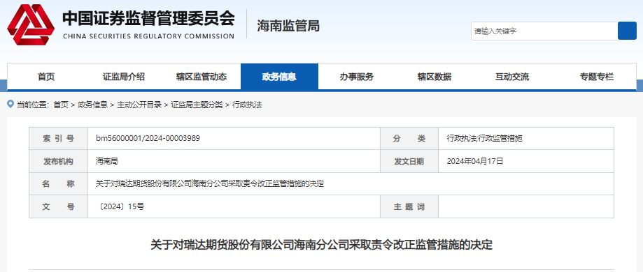 海南证监局对瑞达期货海南分公司采取责令改正的监管措施,并记入资本市场诚信档案数据库。同时要求该公司应采取切实有效的措施,对相关问题进行整改,并在收到决定书之日起30日内提交书面整改报告。