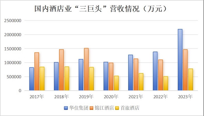 需要注意的是,对比2023年国内酒店“三巨头”近7年的营收状况发现,2023年“三巨头”之间的营收差距拉大。