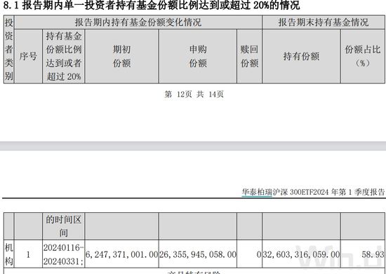 4月22日,华泰柏瑞沪深300ETF发布最新一季报显示,今年一季度,“机构1”增持该基金263.56亿份。“机构1”在报告期初持仓份额为62.47亿份,记者对比发现,“机构1”与中央汇金公司去年年末的持仓份额完全相同。按一季度成交均价3.37元估算,中央汇金即“机构1”一季度增持华泰柏瑞沪深300ETF高达888.62亿元。