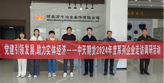 2024年4月17日,在经过多次前期接触与充分准备之后,中天期货有限责任公司委派机构管理总部经理黄磊带领由多部门精通业务的骨干员工组成的工作小组前往河北省万丰冶金备件有限公司进行走访调研。此次活动主题为“党建引领发展,助力实体经济—中天期货2024年度系列企业走访调研活动”。此次活动目的为实地考察企业的生产经营需求,现场为企业提供金融衍生品增值赋能的辅导与初步解决方案。