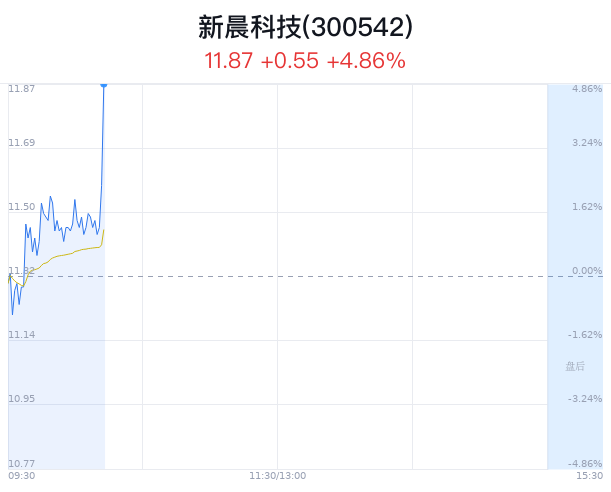 04月23日,新晨科技(300542)股价大幅上涨,截至10点12分,新晨科技上涨5.04%,报11.89元/股,成交7750万元,换手率2.77%,振幅6.10%。