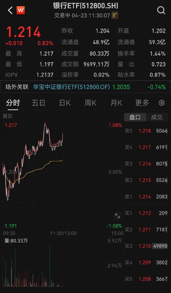 4月23日,A股三大指数震荡走低,银行板块逆市飘红,截至午间收盘,银行ETF(512800)场内价格收涨0.83%,半日成交额近9700万元。板块个股中,交通银行涨超2%,成都银行、工商银行、苏农银行、浦发银行等跟涨居前。