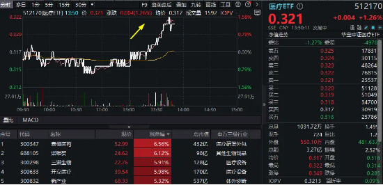 ETF方面,场内热门医疗ETF(512170)午后快速拉升,截至发稿场内价格涨1.26%,冲击两连阳!