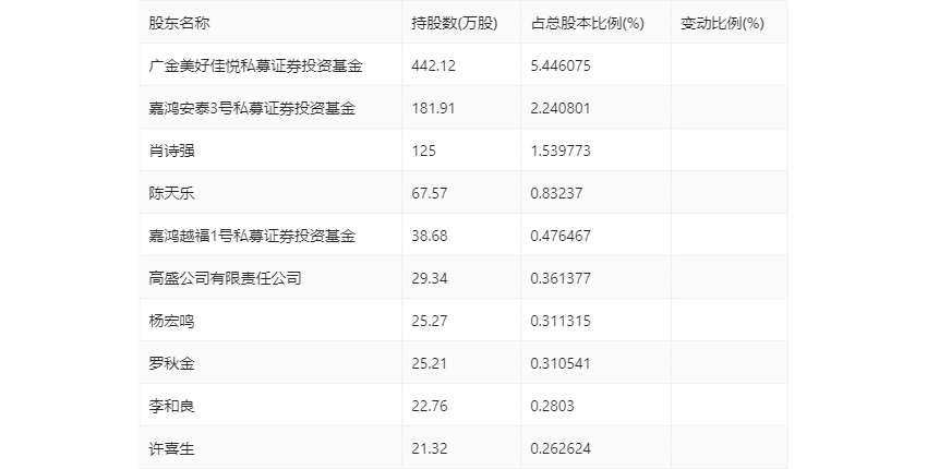 一季报显示,2024年一季度末公司十大流通股东中,新进股东为嘉鸿越福1号私募证券投资基金、高盛公司有限责任公司、李和良,取代了上年末的中信证券股份有限公司、中国国际金融股份有限公司、中信里昂资产管理有限公司-客户资金-人民币资金汇入。在具体持股比例上,嘉鸿安泰3号私募证券投资基金、杨宏鸣、罗秋金持股有所上升,广金美好佳悦私募证券投资基金、肖诗强、陈天乐、许喜生持股有所下降。