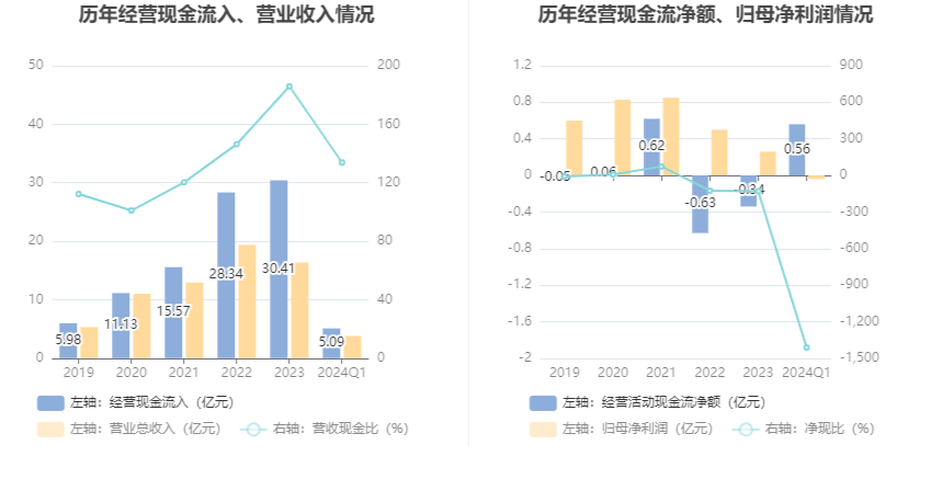 2024年第一季度,公司营业收入现金比为133.85%,净现比为-1412.35%。