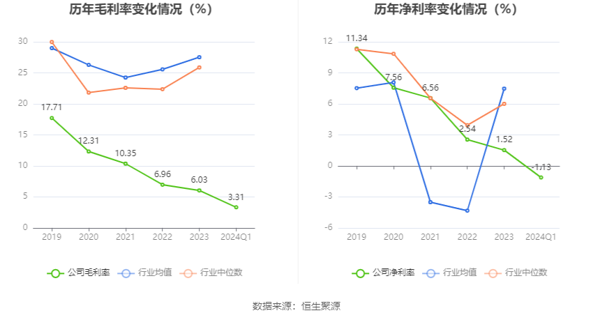 2024年第一季度,公司毛利率为3.31%,同比下降4.19个百分点;净利率为-1.13%,较上年同期下降3.65个百分点。