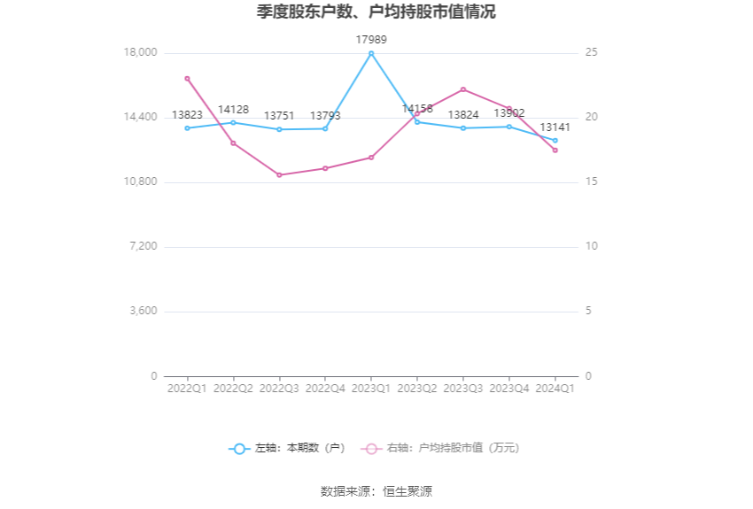 筹码集中度方面,截至2024年一季度末,公司股东总户数为1.31万户,较上年末下降了761户,降幅5.47%;户均持股市值由上年末的20.72万元下降至17.49万元,降幅为15.59%。